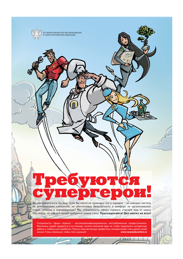 Основная задача рекламной кампании - вызвать интерес к сервисным и рабочим специальностям у школьников и абитуриентов, продемонстрировать важность квалифицированных специалистов, рассказать об имеющихся вузах и ссузах. Учитывая, что целевая аудитория рекламной кампании школьники и абитуриенты, было предложено несколько различных концепций, выполненных в стилистике, которая близка и понятна современной молодежи. Итоговая концепция называется «Требуются супергерои!» и реализована в эстетике комиксов.