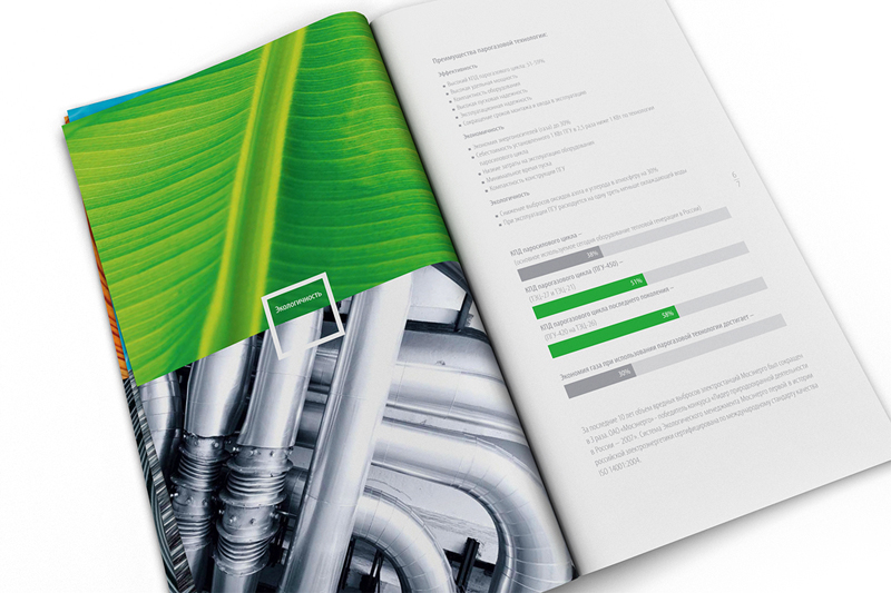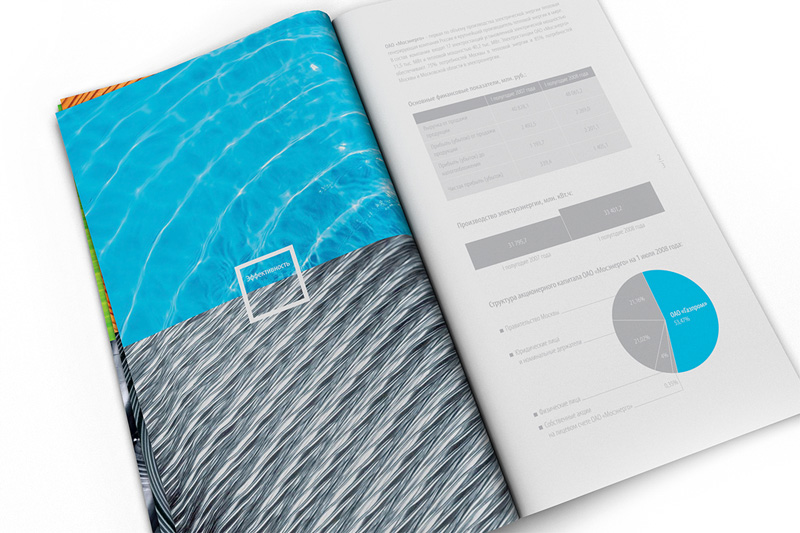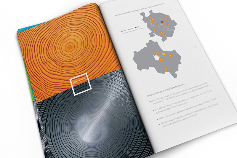 Корпоративный буклет ОАО «Мосэнерго», созданный в 2008 году, был по-настоящему революционным для этой компании. После того как «Мосэнерго» вошло в состав ОАО «Газпром», требовалось радикально поменять стиль рекламных материалов, сделав их яркими и современными. Для буклета и рекламной кампании была выбрана тема ассоциаций между природными и технологическими мотивами.