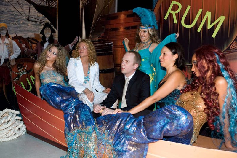 В «Манеже» была создана настоящая портовая атмосфера - с цыганками, предсказывающими судьбу, с хромыми пиратами, втягивающими прохожих в азартные игры, с шарманщиком и настоящими русалками, которые кормили гостей с ложечки красной икрой...